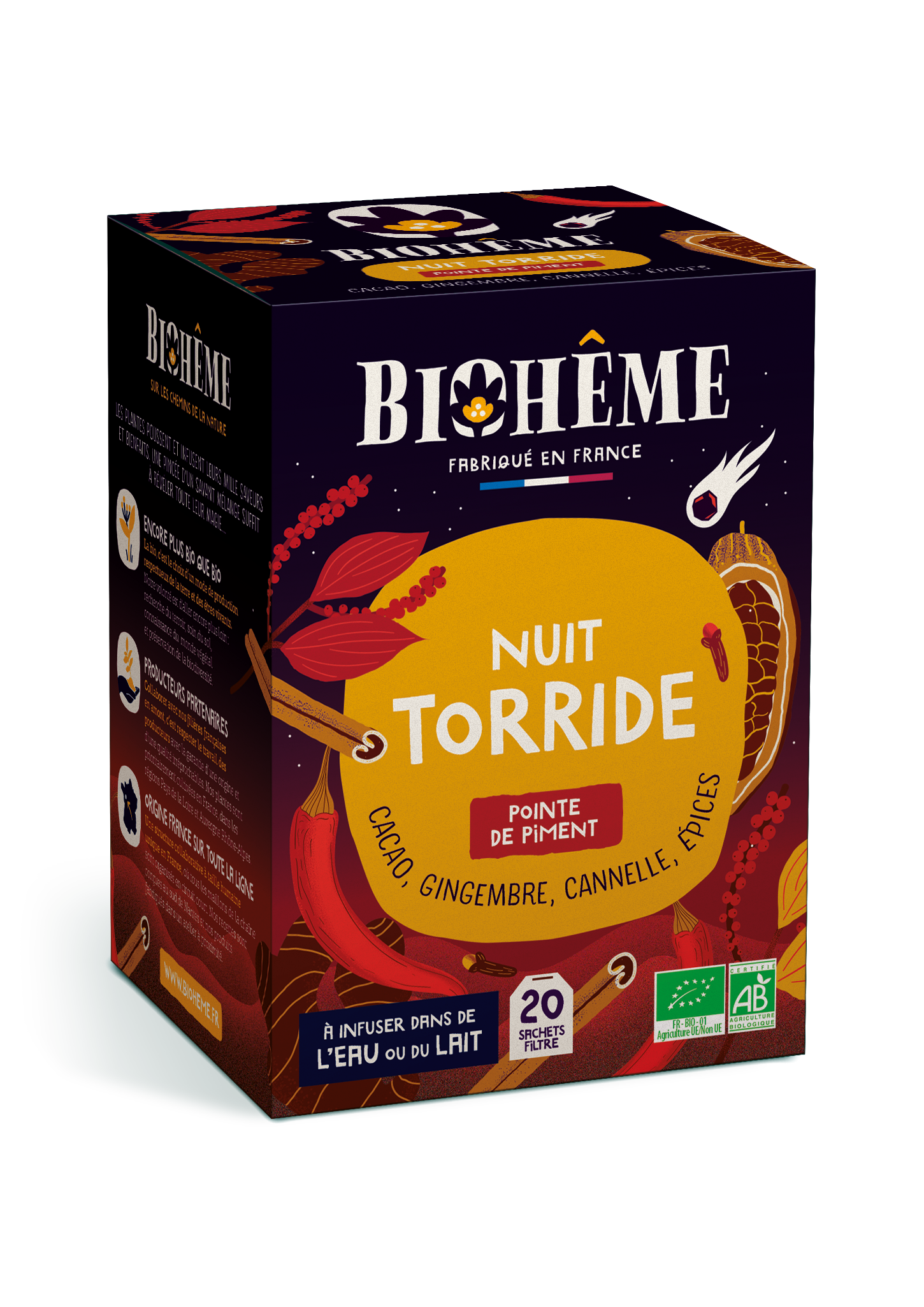 Fabriqué en France en circuit-court.100 % bio.Gingembre, poivre, cardamome, cannelle, girofle et vanille bio et équitables.Étui recyclable en carton issu de forêts françaises et imprimé en France.Enveloppe fraîcheur en fibre de bois et compostable.Zéro-plastique