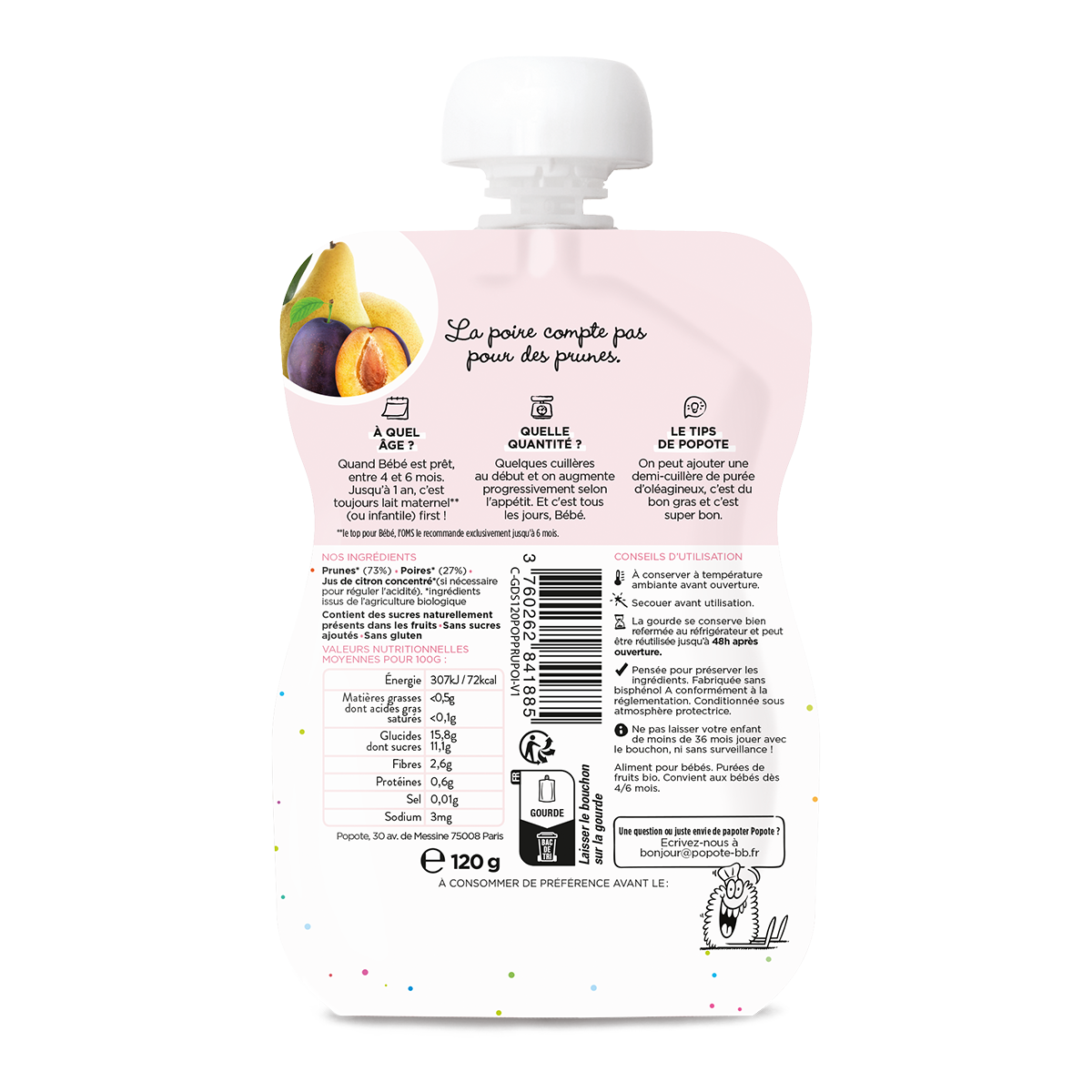 Prunes (73%) - Poires (27%) - Jus de citron concentré (si nécessaire pour réguler l'acidité)